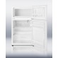 The refrigerator section contains generous door storage for large bottles, an adjustable thermostat for easy temperature management, and a fruit and vegetable crisper to keep your greens under the right conditions. The top freezer is generously sized and includes a convenient door shelf for organization efficiency.