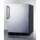 This model has a jet black cabinet and diamond plate wrapped door for an industrial look, with a stainless steel towel bar handle completing the front.. Additional features include interior lighting, a fruit and vegetable crisper, and sturdy door storage, all in a slim 24" width that fits well in limited space.